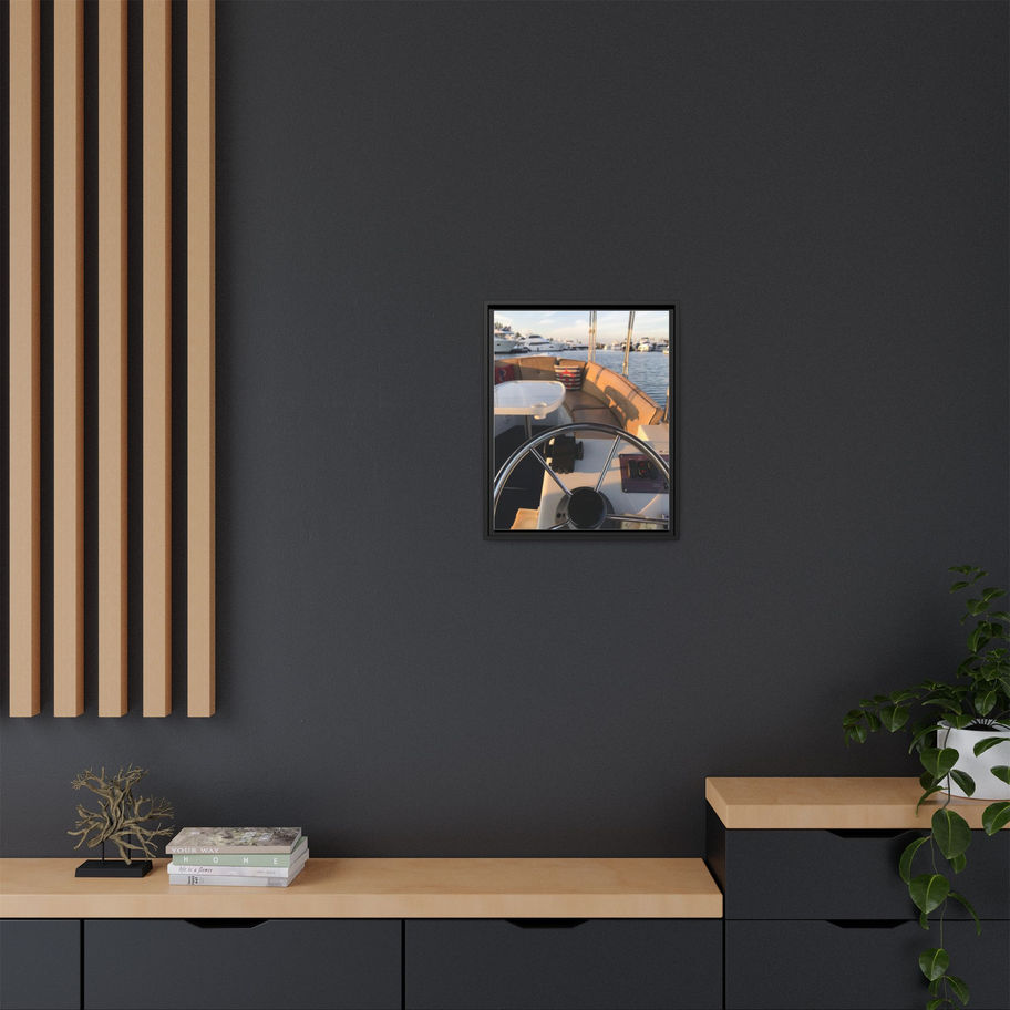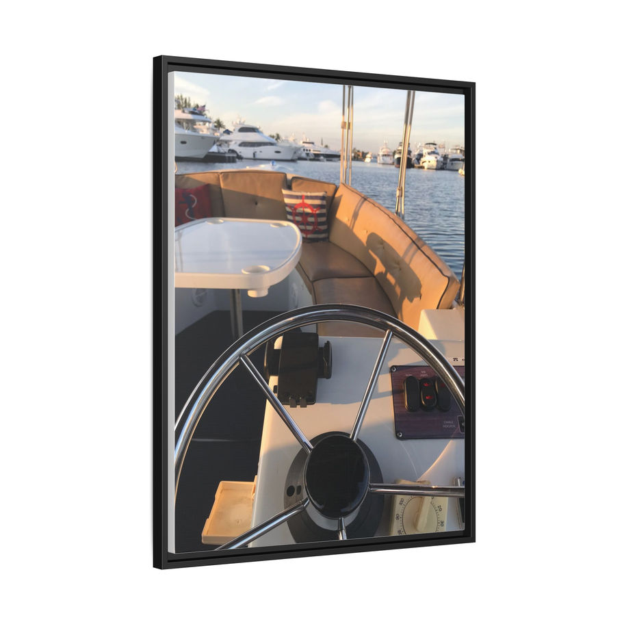 Salt-sweet air, late-afternoon light, and the soft thrum of engines — this matte canvas print brings a quiet harbor moment into your home. The framed, multi-color composition feels like a pause at the helm: warm upholstery, a gleaming wheel, and distant yachts softened by a gentle haze. Hung in a hallway, study, or lakeside cottage, it becomes a small window to maritime calm that invites slow breaths and daylight memories.